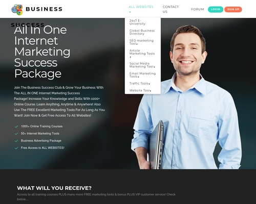 ¡Únase al Business Success Club y haga crecer su negocio con el Paquete de éxito de marketing en Internet TODO EN UNO! Aumente sus conocimientos y habilidades con más de 1000 cursos en línea. ¡Aprenda cualquier cosa, en cualquier momento y en cualquier lugar! ¡Utilice también las excelentes herramientas de marketing GRATUITAS durante el tiempo que desee! ¡Únase ahora y obtenga acceso gratuito a todos los sitios web!
