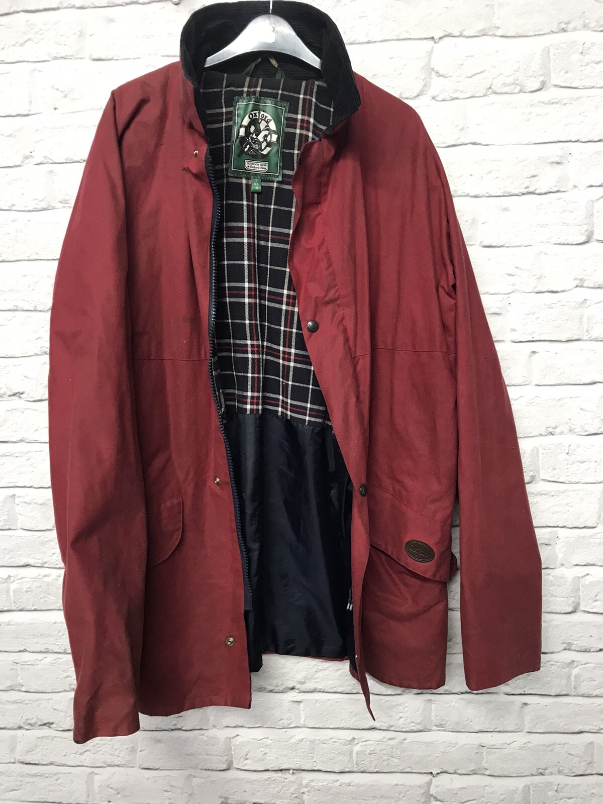 Abrigo de cera Oxford para exteriores en rojo, tamaño de etiqueta UK 42